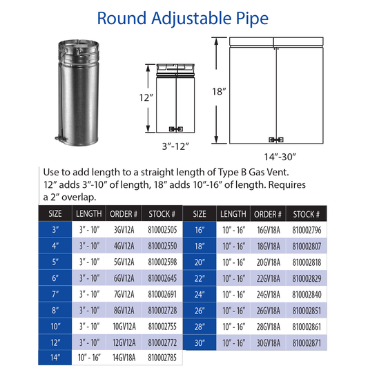 DuraVent Type B 12 Inch Length Round Adjustable Pipe - 4BV12A