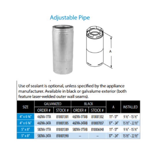 DuraVent DirectVent Pro 17-24 Inch Adjustable Pipe - Galvanized Direct Vent Pipe For Gas Fireplaces & Gas Stoves - 58DVA-24TA