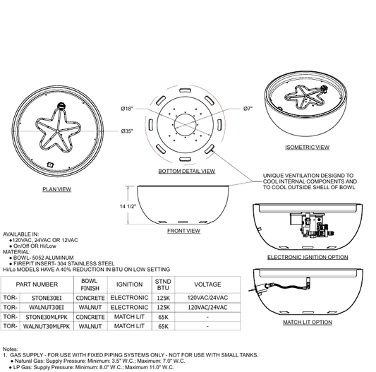 HPC Torpedo Aluminum Spun Bowl HiLo Ignition Outdoor Gas Firepit - TOR-STONE30EI-HI/LO