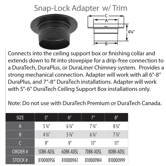 DuraVent DuraBlack 5 Inch Diameter Black Snap-Lock Adapter w/Trim - 5DBK-ADSL