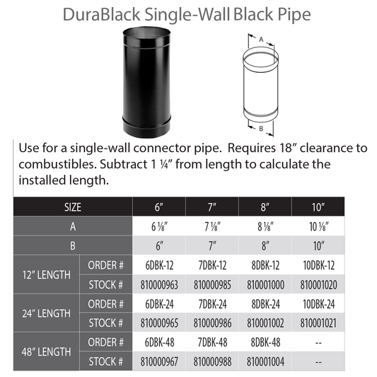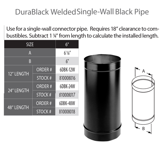 DuraVent DuraBlack 6 Inch Diameter Black 22 Gauge 48 Inch Pipe Length - 6DBK-48W