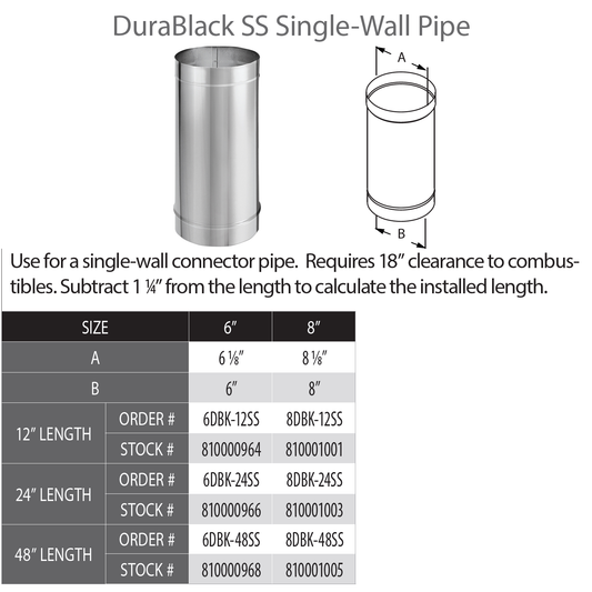DuraVent DuraBlack 6 Inch Diameter Single Wall Stainless Steel 48 Inch Pipe Length - 6DBK-48SS