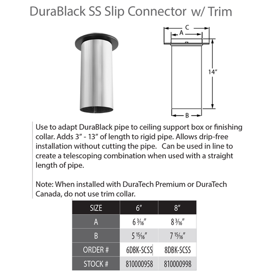 DuraVent DuraBlack 6 Inch Diameter Stainless Steel Slip Connector w/trim - 6DBK-SCSS