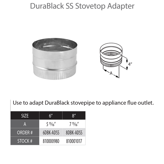 DuraVent DuraBlack 6 Inch Diameter Stainless Steel Stovetop Adapter - 6DBK-ADSS