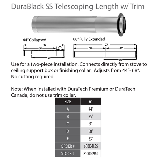 DuraVent DuraBlack 6 Inch Diameter Stainless Steel Telescoping Length 44 Inch - 68 Inch w/trim - 6DBK-TLSS